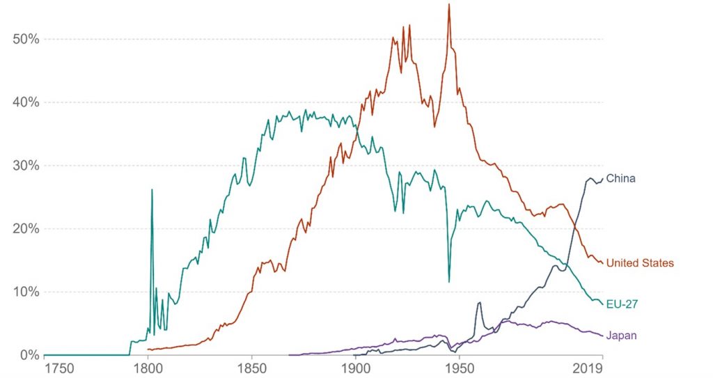 As the world’s second-largest economy, China plays a crucial role in global climate change. In 1978 it enacted the Reform and Opening-up policy leading to sustained economic growth and prosperity. However, the successful strategy also led to an accompanying increase in CO2 emissions. China’s share of global CO2 emissions overtook the United States in 2006 and in 2019, its share was up to 27.9%, almost one third of the total global CO2 emissions.