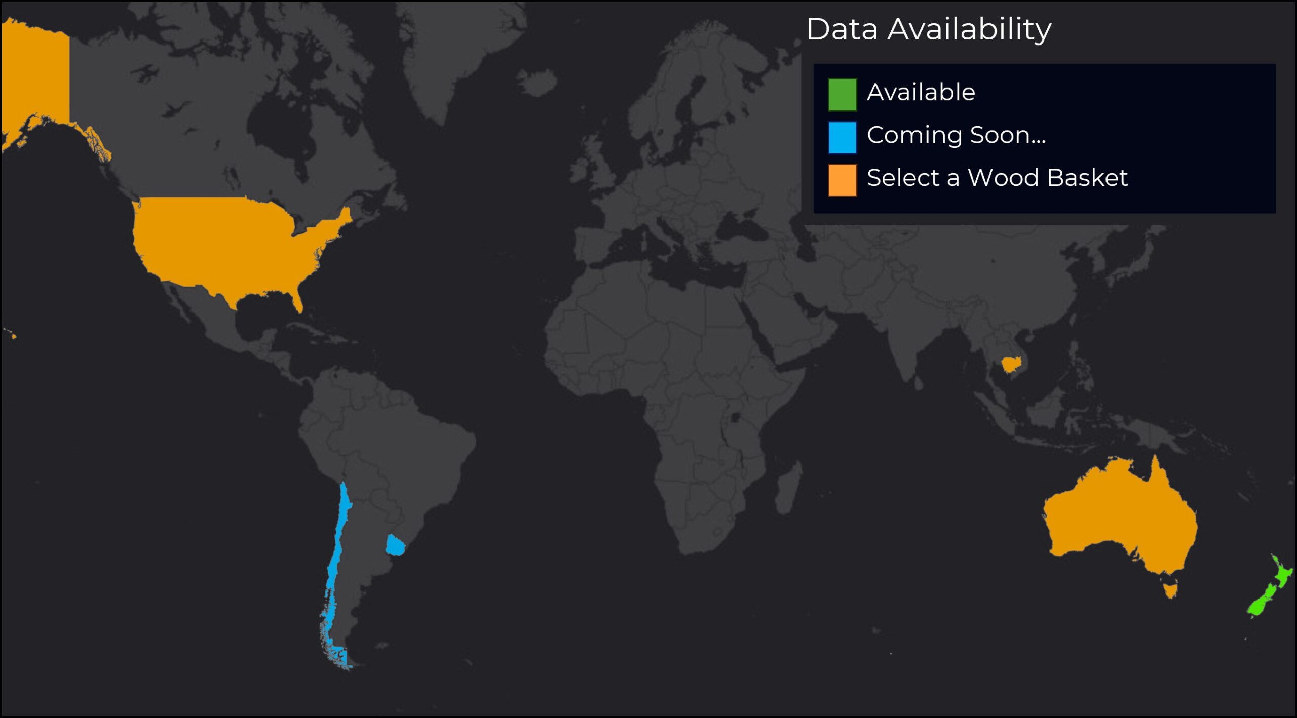 Coverage includes New Zealand and selected regions of Chile and Uruguay, with the option to commission a wood basket to support specific analyses in additional designated countries.